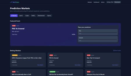 BetChain is a decentralized prediction market dApp that allows users to place ETH-based bets on real-world events. Built with Solidity, React, and Prisma, it ensures transparent and automated payouts via smart contracts on the Sepolia testnet.